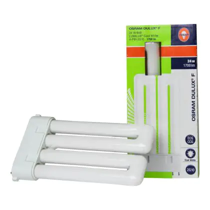 De Osram DULUX F lampen zijn compacte fluorescentielampen. De lichtbronnen zijn zeer zuinig en hebben een goede lichtkwaliteit. U herkent de Osram DULUX F 24W 840 eenvoudig aan de 2G10 lampvoet met 4 pinnen. De lichtbron is 165 cm lang. Op het moment dat de afmeting van uw huidige lamp sterk afwijkt van 165 cm heeft u een ander wattage in gebruik.